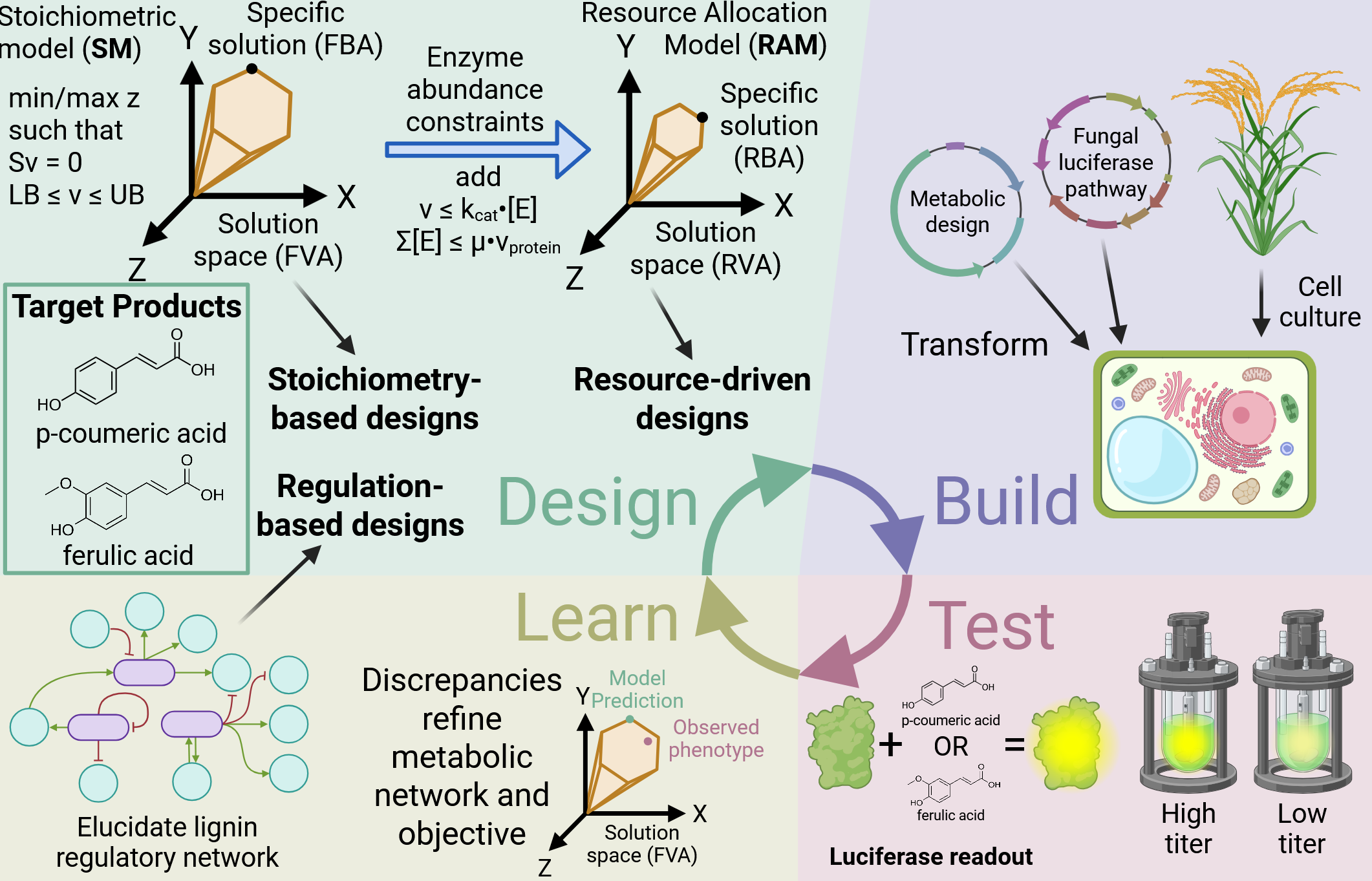 Lignin is heterogeneous in terms of bonds and cross linking, as well as monomers composition. These factors make deconstruction and subsequent valorization difficult, respectively, due to the need for a diverse array of chemical rearrangements to arrive at a desired product. A potential solution to this is metabolic funneling, producing a limited number and type of platform chemicals that can be catalytically upgraded to a diverse array of products. Current limitations of metabolic funneling in plant cells include: i) poorly characterized metabolic pathways; ii) relatively slow phenotypic and metabolic analyses; and iii) the need for large multigene constructs. In addressing both challenges, we seek to accelerate the design-build-test-learn (DBLT) cycle in plant lignin engineering with ready applications to other lignin monomer-derived metabolites. We are currently interested in a renewable, sustainable source of aromatic chemicals.